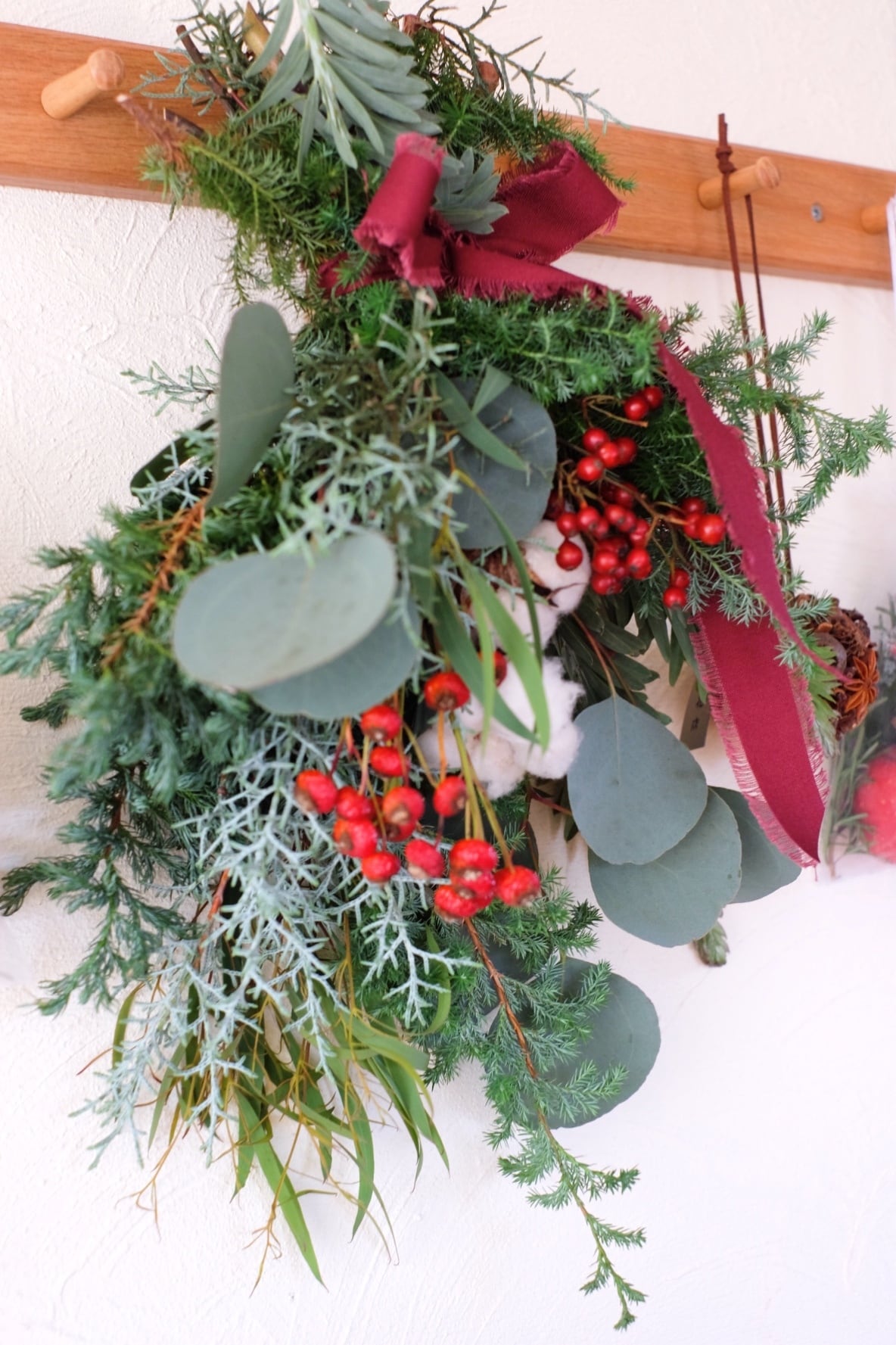 使用花材:針葉樹、ユーカリ、コットン、野バラの実など