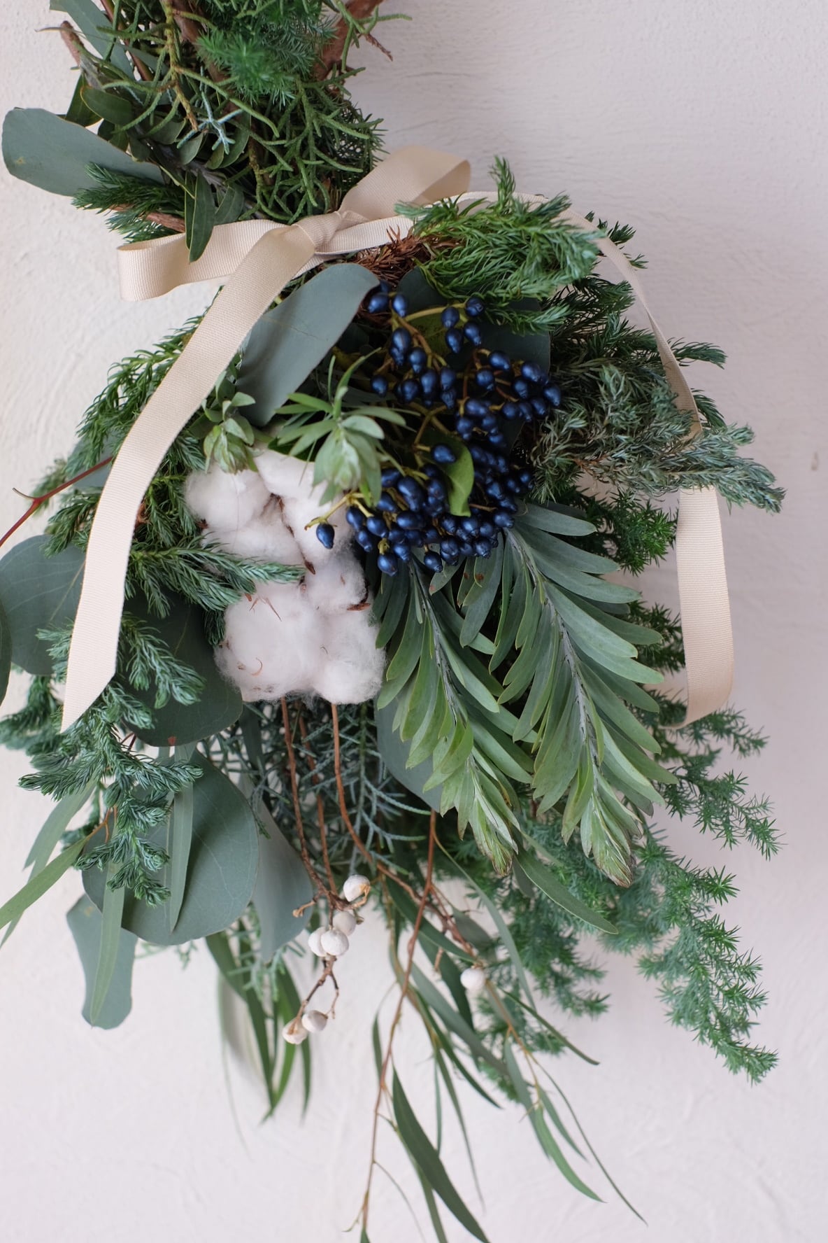フレッシュの針葉樹やグリーンをたっぷりと使って、コットンと一緒に可愛らしく束ねました。